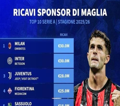 北京时间11月30日,德转统计出了本赛季意甲俱乐部球衣胸前广告年赞助费TOP10,AC米兰和国际米兰以3000万欧元并...