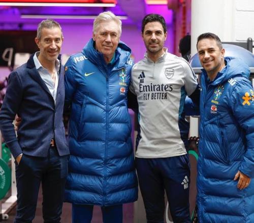 巴西队在阿森纳基地训练,安切洛蒂与阿尔特塔会面并合影